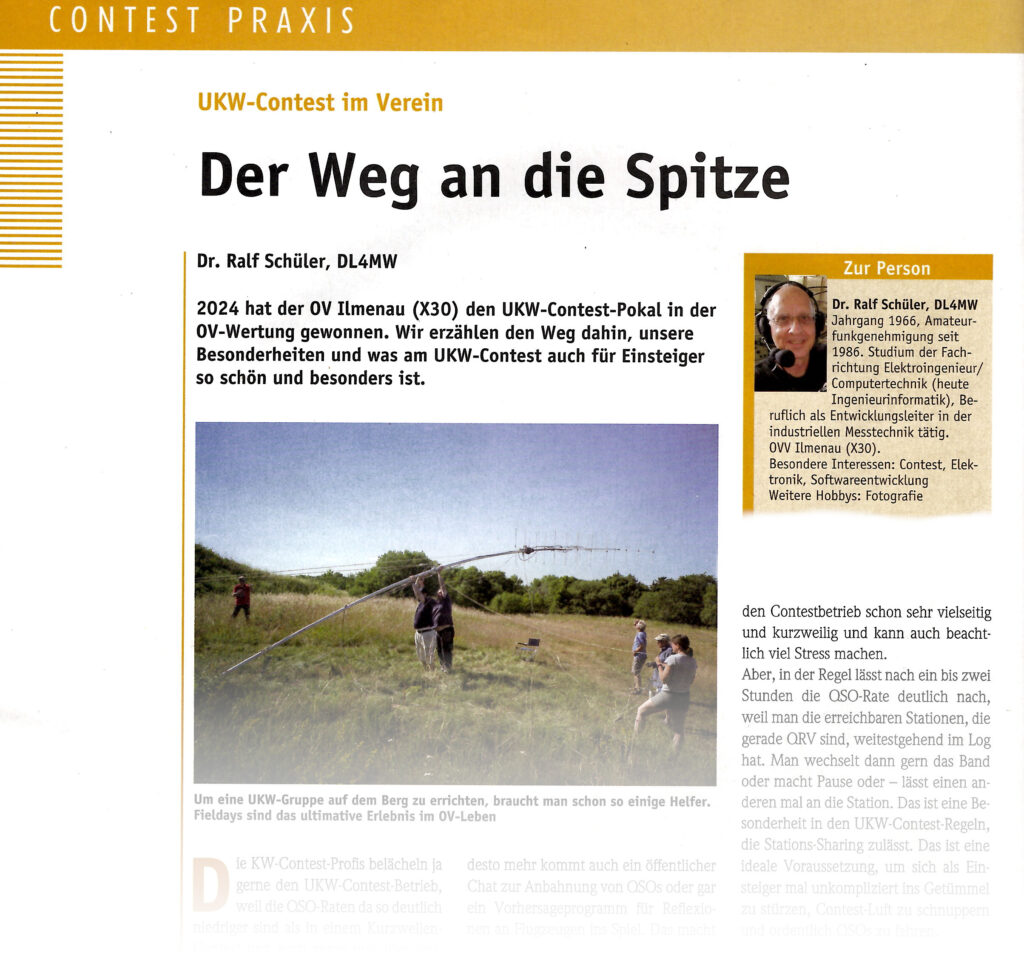 Aus Ilmenau sind wir hier gleich mit zwei Artikeln vertreten, einmal über die Geschichte der Nationalmannschaft DA0HQ zur IARU HF Championship und deren Anfänge in Ilmenau. Zum anderen über die Aktivitäten des Ortsverbands X30 Ilmenau im DARC UKW Contest Pokal und der Weg zum Gewinn des Pokals als verhältnismäßig kleiner Verein.
