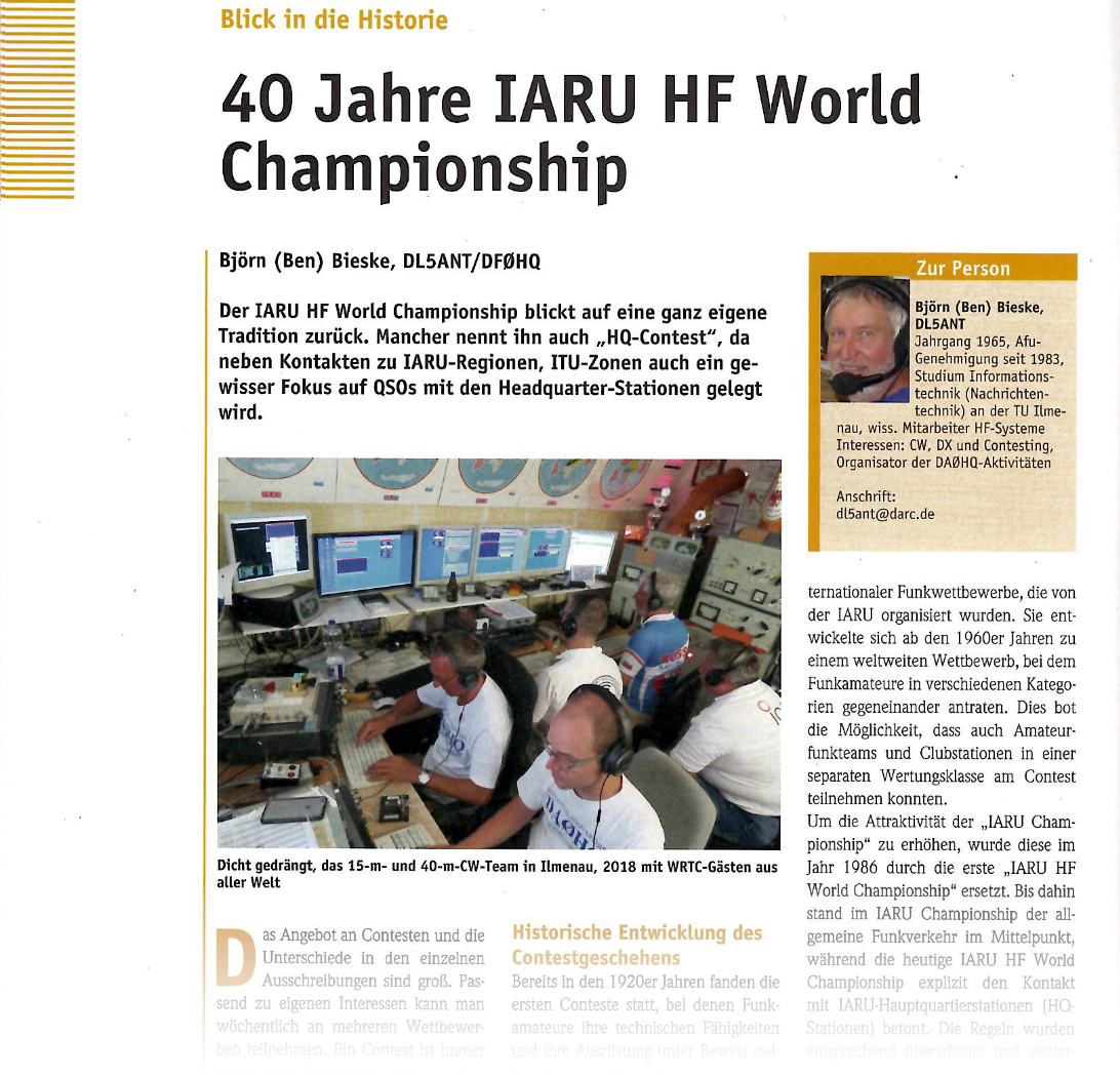 Aus Ilmenau sind wir hier gleich mit zwei Artikeln vertreten, einmal über die Geschichte der Nationalmannschaft DA0HQ zur IARU HF Championship und deren Anfänge in Ilmenau. Zum anderen über die Aktivitäten des Ortsverbands X30 Ilmenau im DARC UKW Contest Pokal und der Weg zum Gewinn des Pokals als verhältnismäßig kleiner Verein.